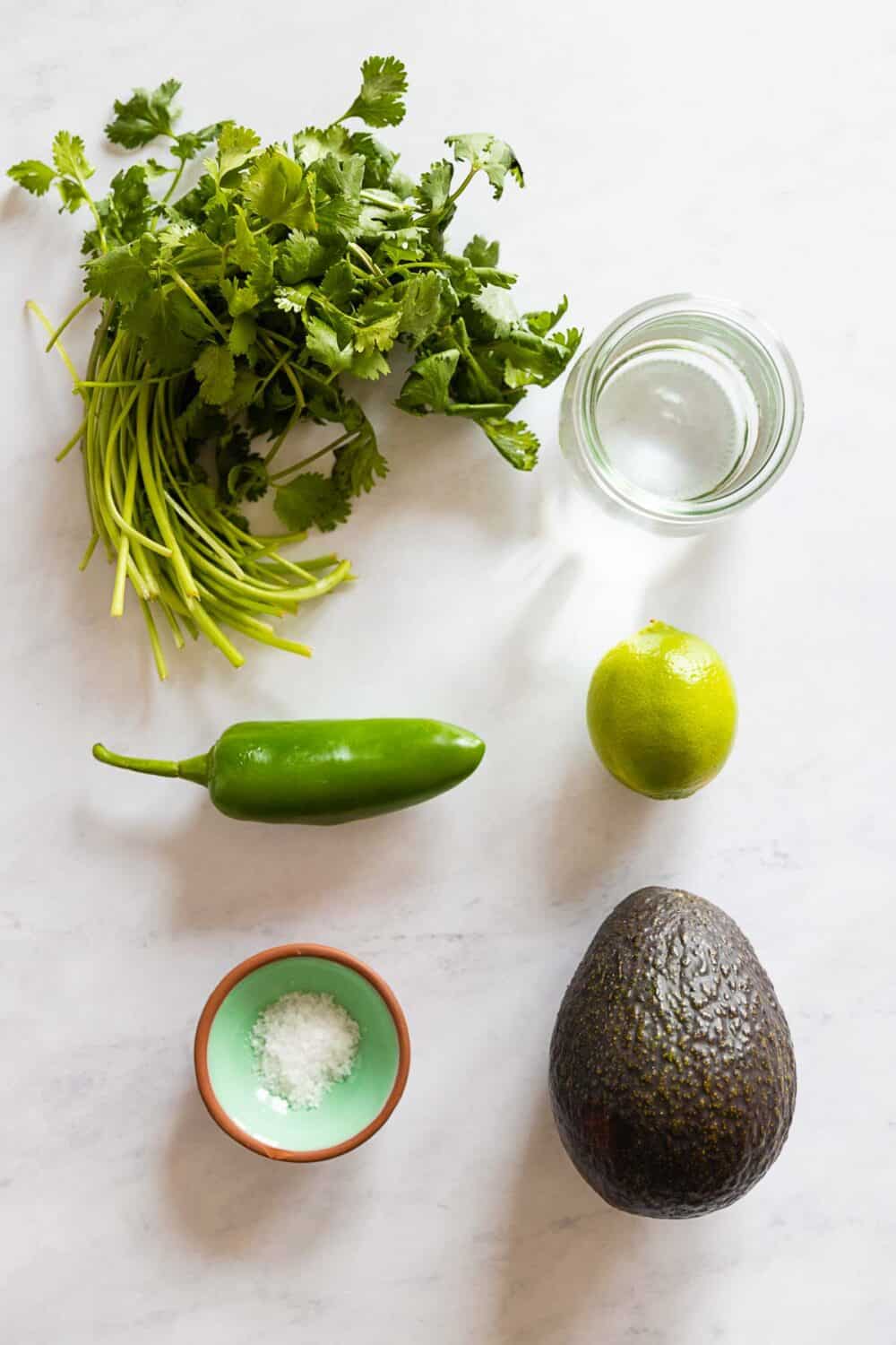 - Add all but avocado — add a handful of cilantro, sea salt, lime juice, a splash of water, and a deseeded jalapeño to a jar that fits your immersion blender.