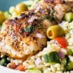 Orzo – you can use any other “pastina” (little pasta) in this dish. The best substitutions would be Ditalini, Stelline, or even small elbow Macaroni. I’ve also made this exact same Mediterranean Chicken Recipe with farro before and it’s incredible!