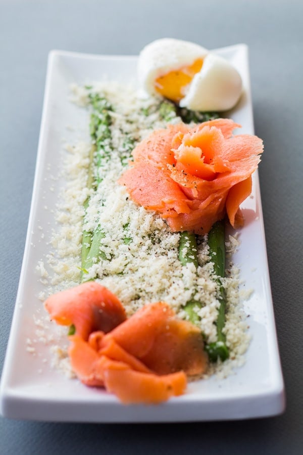 - Place asparagus on plate and grate Parmesan over piping hot vegetables, then add smoked salmon and peeled egg.