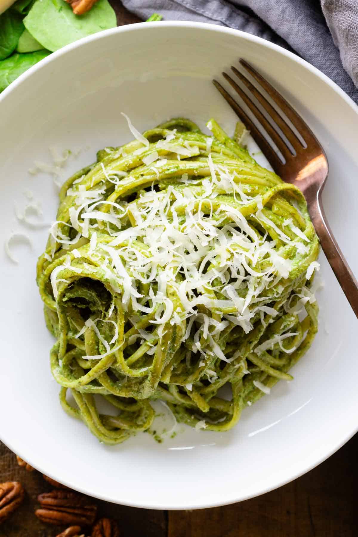 - Mix the tallarines verdes in a large pan and add a splash of pasta water if you notice the sauce is too thick. Swoosh it all around until the pasta is all covered in sauce. Then serve in a shallow bowl.
